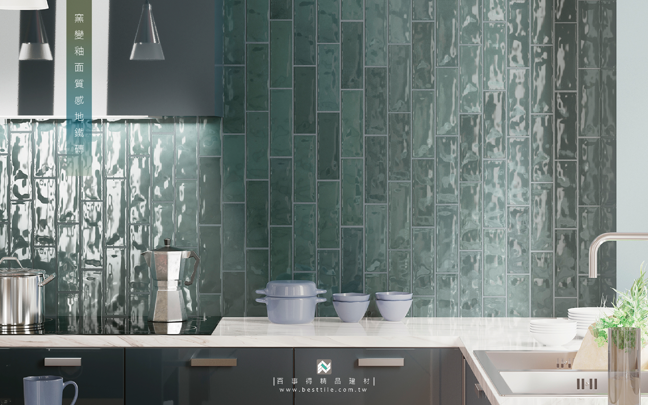 不妨將牆面改用藍綠色窯變地鐵磚,營造出一處吸睛的視覺焦點,