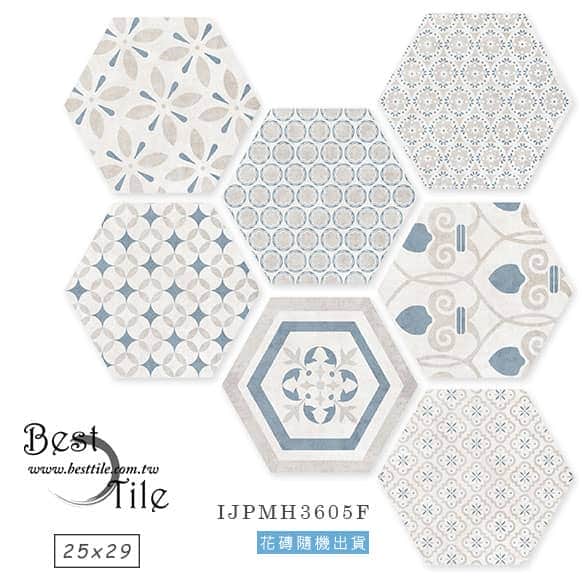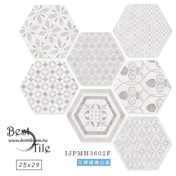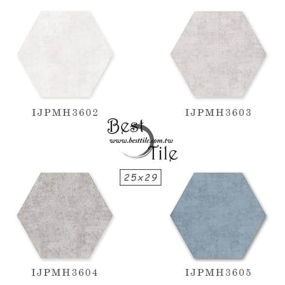 IJPMH3602 - 棉花白 IJPMH3603 - 迷霧灰 IJPMH3604 - 日暮灰 IJPMH3605 - 尼羅藍 IJPMH3602F - 棉花白(花磚隨機出貨) IJPMH3605F - 尼羅藍(花磚隨機出貨) ▲六角磚,幾何、六角、蜂巢,現代風、工業風,咖啡廳、特殊造型磚、花磚