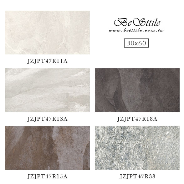 JZJPT47R11A - 雲霧白 JZJPT47R15A - 布朗棕 JZJPT47R13A - 迷霧灰 JZJPT47R18A - 夜幕黑 JZJPT47R33 - 羅馬灰 (厚度1cm) ▲電視牆、主牆、浴室廁所、戶外地板、牆壁、公共空間、客廳、臥房、餐廳、廚房、衛浴、戶外牆、大理石、花崗石、板岩