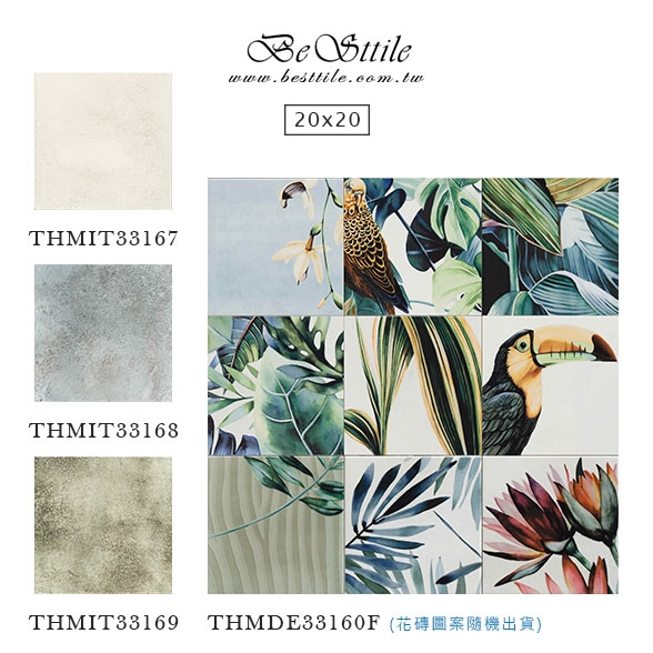 THMIT33167 - 玄月米 THMIT33168 - 水泥灰 THMIT33169 - 嫩葉綠 THMIT33160F - 花磚 (圖案隨機出貨) ▲手工花磚、精緻花磚、典雅花磚,水泥花磚、拼圖花磚、玄關花磚、地毯花磚、幾何花磚,立體花磚、歐式古典花磚、西班牙鄉村花園。